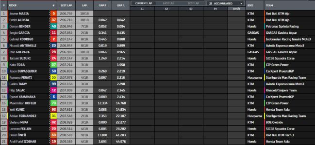 Masiá este año aparece en muchos pronósticos como principal favorito al título y ha demostrado que la presión no le pesa, porque ha cumplido a las primeras de cambio consiguiendo su cuarta victoria mundialista. Con el que nadie contaba para ganar antes de que arrancara el GP era con Acosta, porque se trata de un novato de 16 años, aunque ya el viernes se encargó de poner a todos en alerta al conseguir el mejor tiempo en el primer entrenamiento de su vida en un GP. Eso es una tarjeta de presentación y lo demás son tonterías. Él de Mazarrón (Murcia) fue uno de los ocho que llegó a liderar la carrera y otro que también lo hizo, aunque sólo durante un leve instante fue Guevara. El mallorquín es otro novato que también dejó el sello en la primera aparición mundialista de su vida, con el segundo puesto en la calificación y el séptimo de la carrera, rodando con mucho desparpajo junto a los mejores a pesar de contar también con sólo 16 años.