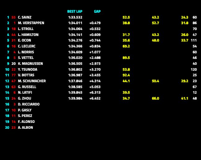 Sainz voló con el C3 y batió todos los registros con el C4, marcó un 1:33.532 que permanece como el mejor tiempo de la semana, aunque a juzgar por las caras en el garajes, hay margen para algo más. De hecho, con el C5 no mejoró. Están lejos de la pole del curso pasado, porque los monoplazas han cambiado, pero con una ventaja de casi cinco décimas sobre el RB18 de Verstappen, mismo compuesto. A medio segundo se quedó también Stroll con el Aston Martin, y eso despista, porque Ferrari puede estar delante, pero el coche verde no debería estar a la altura del campeón del mundo. A cuatro décimas estaría Gasly (Alpha Tauri) con su vuelta del jueves.