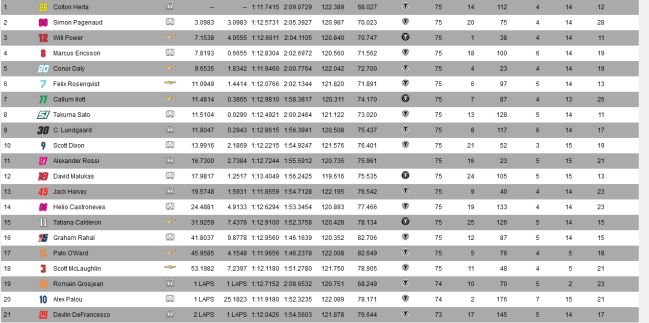 La prueba continuó con constantes trifulcas, banderas amarillas, idas y venidas a los neumáticos de agua y seco y vuelta para atrás, trompos, toques e incluso amago de dar por finalizada la la acción. Un despropósito inexplicable. Solo estaba claro que no se iban a completar todas las vueltas previstas, y se finalizaría con tiempo máximo permitido de dos horas. Y en esa locura reinó Herta, primera de Andretti, con Pagenaud segundo y Power, tercero y nuevo líder del campeonato con 12 de ventaja sobre Mclaughin, 15 sobre Newgarden y 25 sobre Palou, que perdió el liderato y en las 500 Millas querrá revancha.