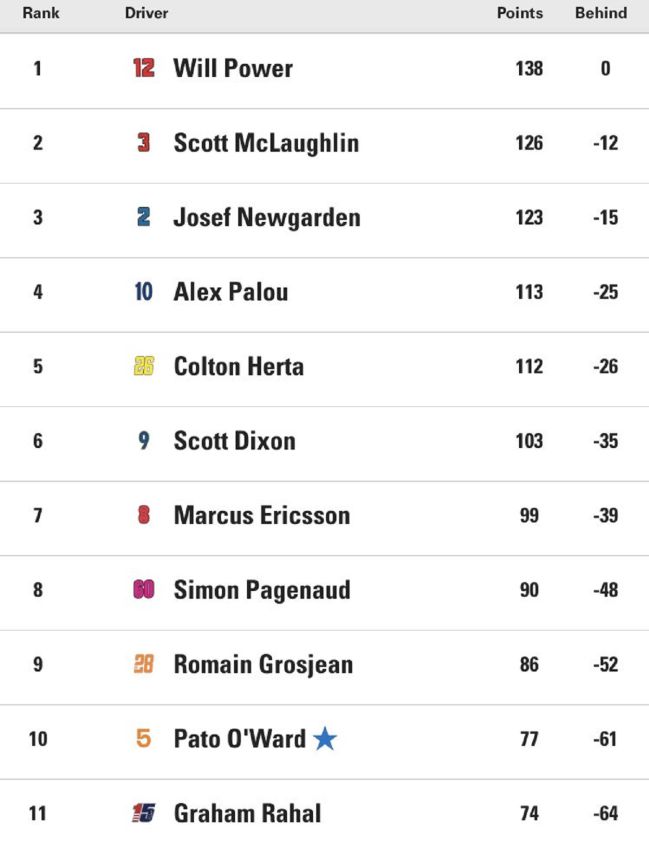 A partir de ahí cambió todo para él, cola del pelotón y con una estrategia suplicando por lluvia o banderas amarillas. Algo. Y sucedió todo. Varias veces pero nunca pudo aprovecharlo del todo el barcelonés. Desde el box animaban al campeón a empujar y escalar todo lo posible. Tampoco le fueron mejor las cosas a Newgarden, 25º, y McLaughlin, quien sobrevivía en en el top-10 pero erró la estrategia y acabó 18. Así les fue a los primeros de la general, mientras que por delante, había valientes a por todo como Herta, líder, salvando cruzadas imposibles, seguido por los dos McLaren, O’Ward y Rosenqvist. Mientras se esperaba la lluvia seguían pasando cosas en pista: Dixon sin combustible, Dalton Kellett al muro provocando una amarilla que Palou no pudo aprovechar para desdoblarse.