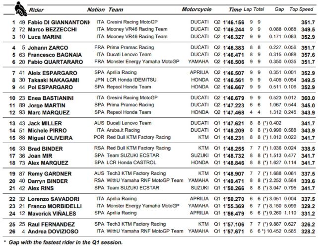 A la hora de la verdad, Fabio dio la sorpresa al lograr su primera pole en MotoGP y estuvo seguido por otro novato, Bezzecchi, al que siguió para cerrar la primera fila Marini, es decir, que los dos pilotos del equipo de Rossi, en el día en el que se retiró su dorsal #46 de MotoGP, le hicieron un regalo extraordinario al nueve veces campeón del mundo.